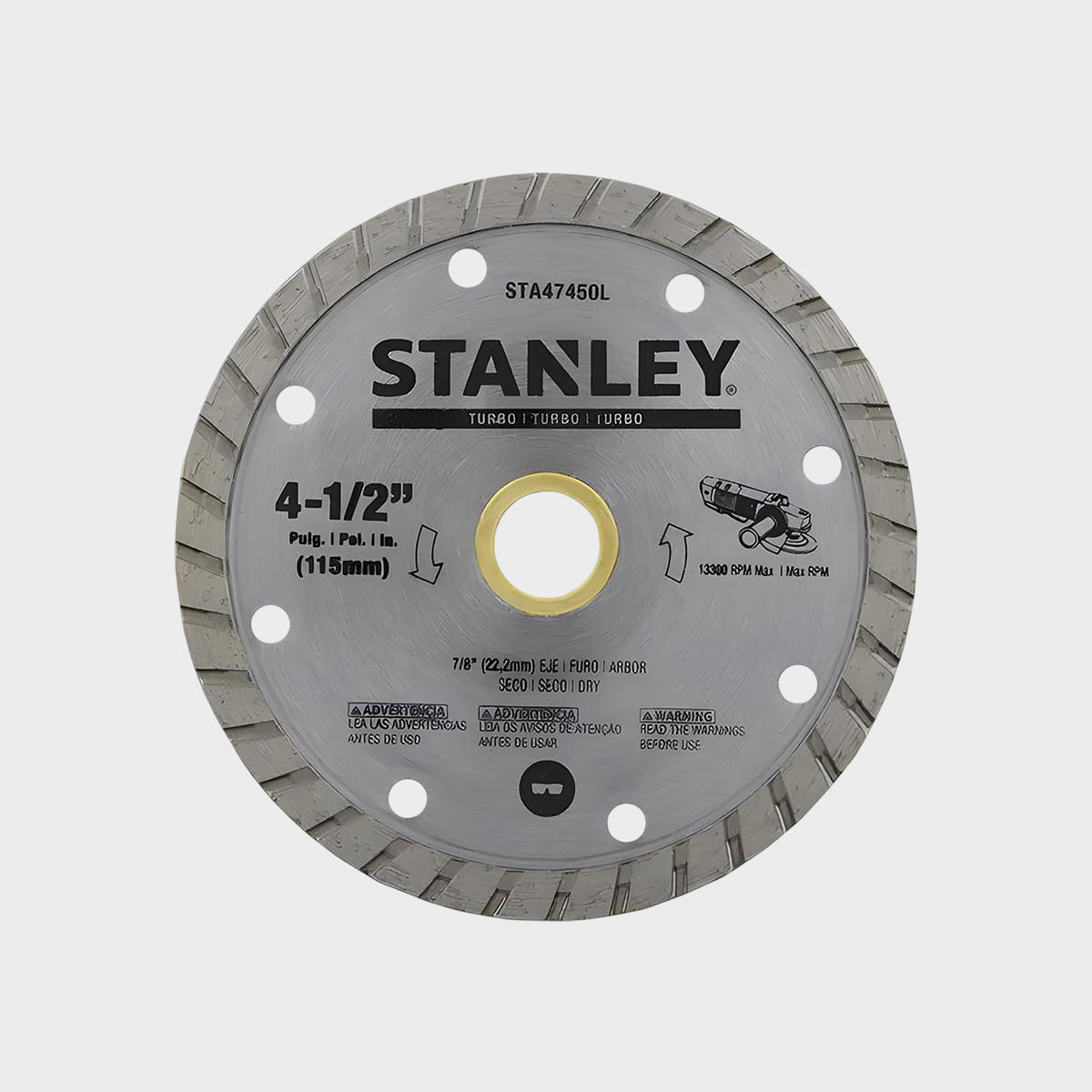 NOMBRE DEL PRODUCTO: DISCO DIAMANTADO TURBO 4-1/2" X 7/8" MARCA: STANLEY SKU: DIS761 MODELO/REFERENCIA: STA47450L CATEGOR�A PRINCIPAL: ACCESORIOS / DISCOS DE CORTE Y DESBASTE PESO: NO ESPECIFICADO DESCRIPCI�N CORTA: DISCO DE 4-1/2" (115MM) CON EJE DE 7/8" (22.23MM) Y ESPESOR DE 0.080" (2.1MM), FABRICADO CON CUERPO DE ACERO DE ALTA CALIDAD Y SEGMENTOS DE DIAMANTE INDUSTRIAL. DISE�O TIPO TURBO PARA CORTES M�S R�PIDOS Y LIMPIOS EN GRANITO, MAMPOSTER�A Y CONCRETO. FUNCIONA EN CONDICIONES SECAS O H�MEDAS Y SOPORTA HASTA 13,300 RPM. OFRECE MAYOR VIDA �TIL Y ACABADO FINO EN COMPARACI�N CON DISCOS ABRASIVOS CONVENCIONALES. IDEAL PARA ESMERILADORAS ANGULARES EN APLICACIONES DE CONSTRUCCI�N Y REMODELACI�N.